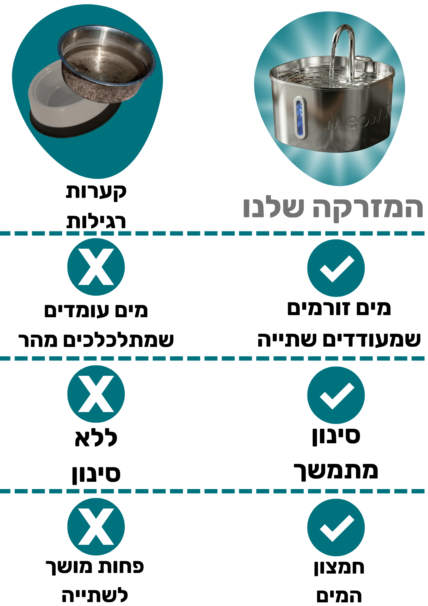 הקערה הרגילה… המים עומדים, והחתול לא שותה מספיק. גם מזרקות פלסטיק לא עוזרות — הן מתלכלכות, ריחות מצטברים, והמים לא נשארים טריים.